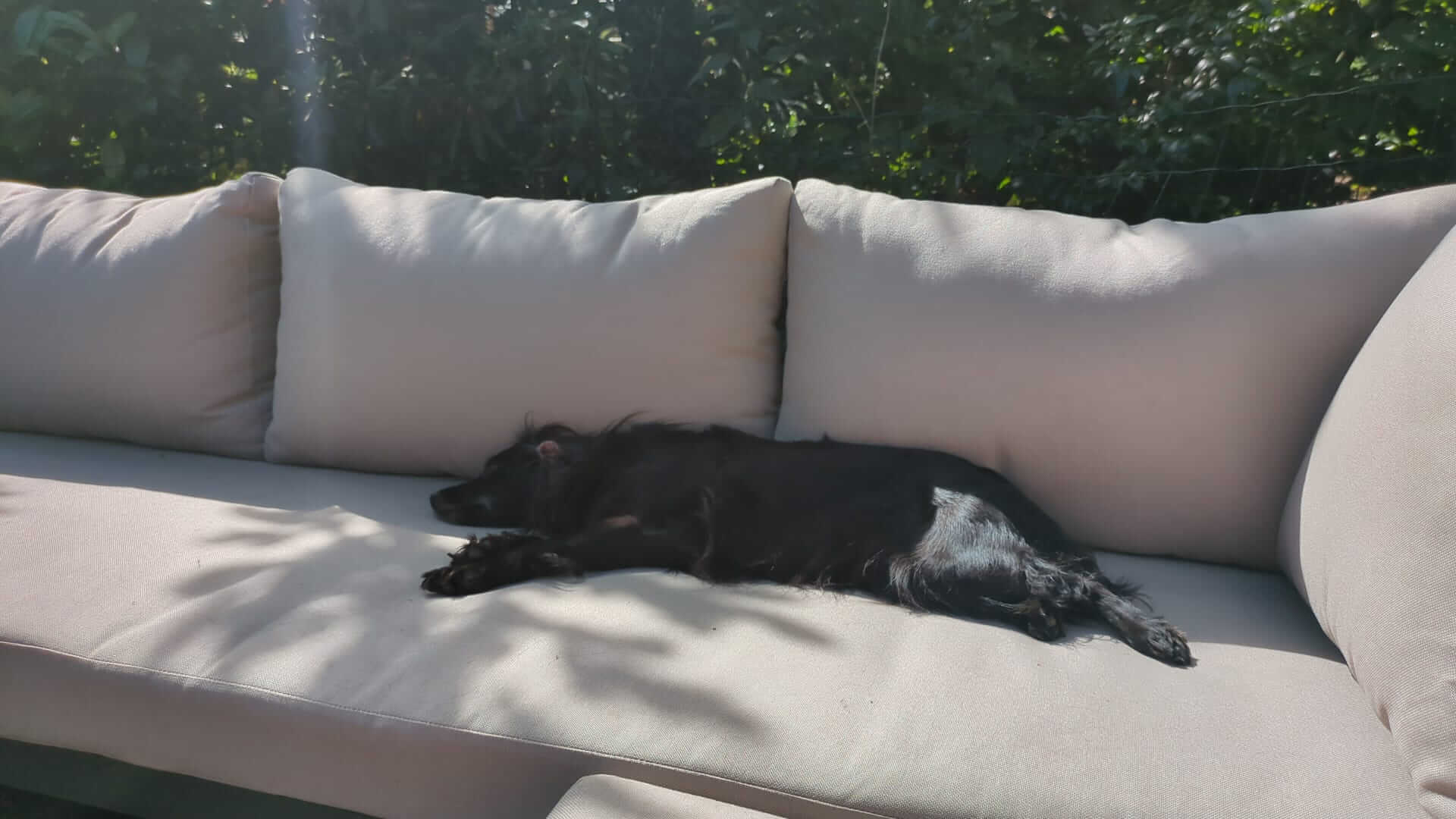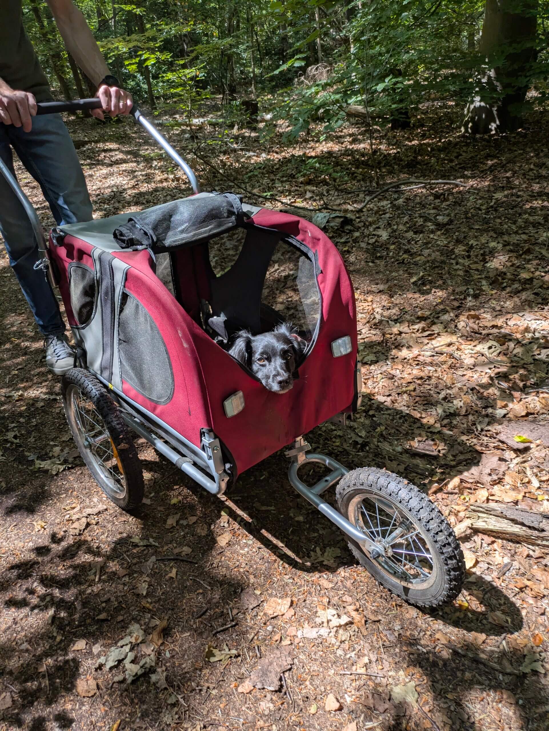 Jikke heeft het in ieder geval nog niet heel zwaar, een sprintje om de duiven in de tuin te verjagen zit er nog gewoon in. Met wandelen is ze wel na een half uur moe, dan gaat ze lekker in de kar.