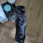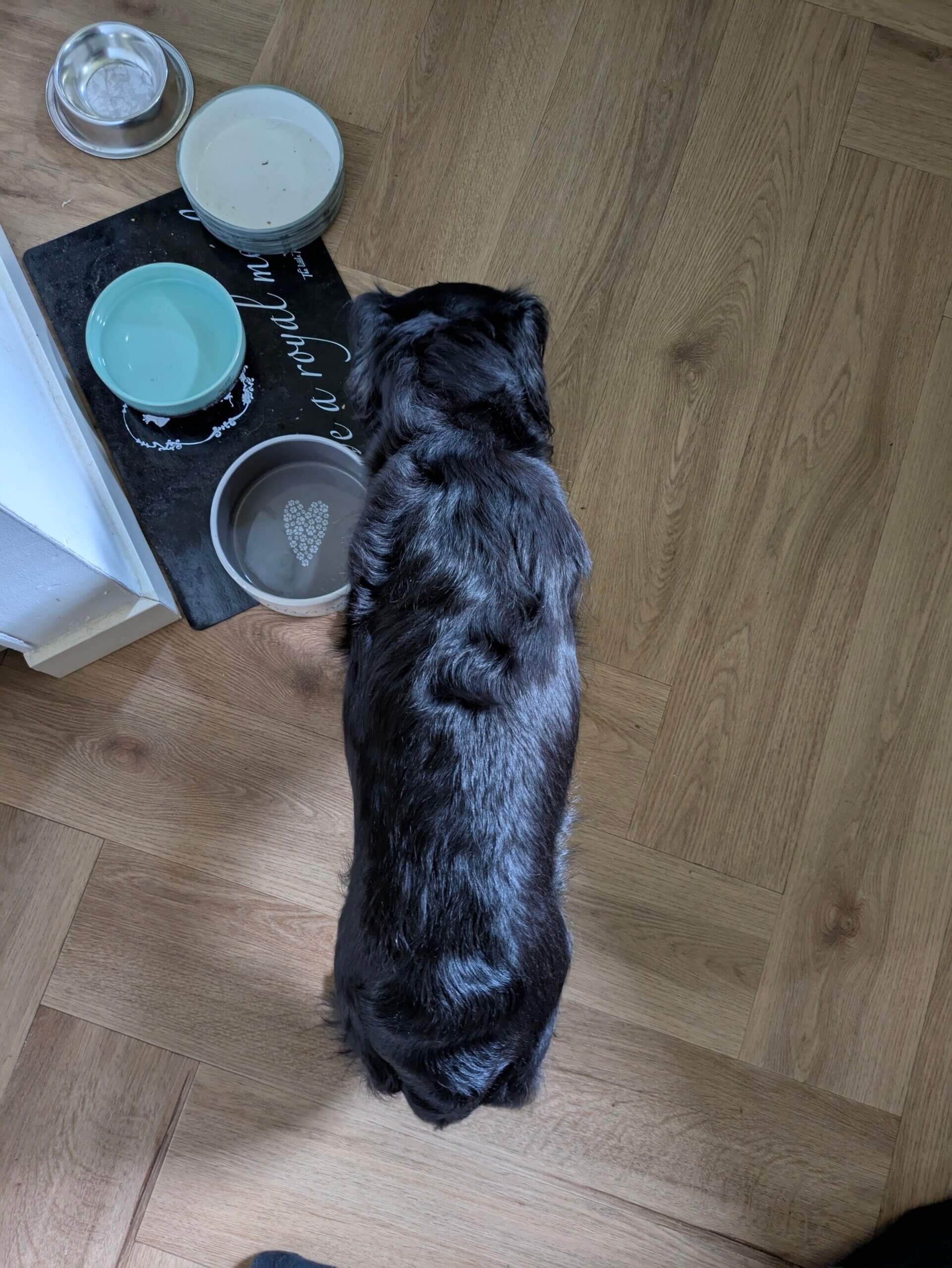 Nu met 8,5 week is ze nog steeds maar een halve kilo aangekomen, ze heeft wel een behoorlijk brede rug gekregen en buikomvang is 5 cm toegenomen. Ze draagt de pups vrij hoog, ze zijn daardoor ook lastig te voelen, maar af en toe voelen we subtiele beweging.